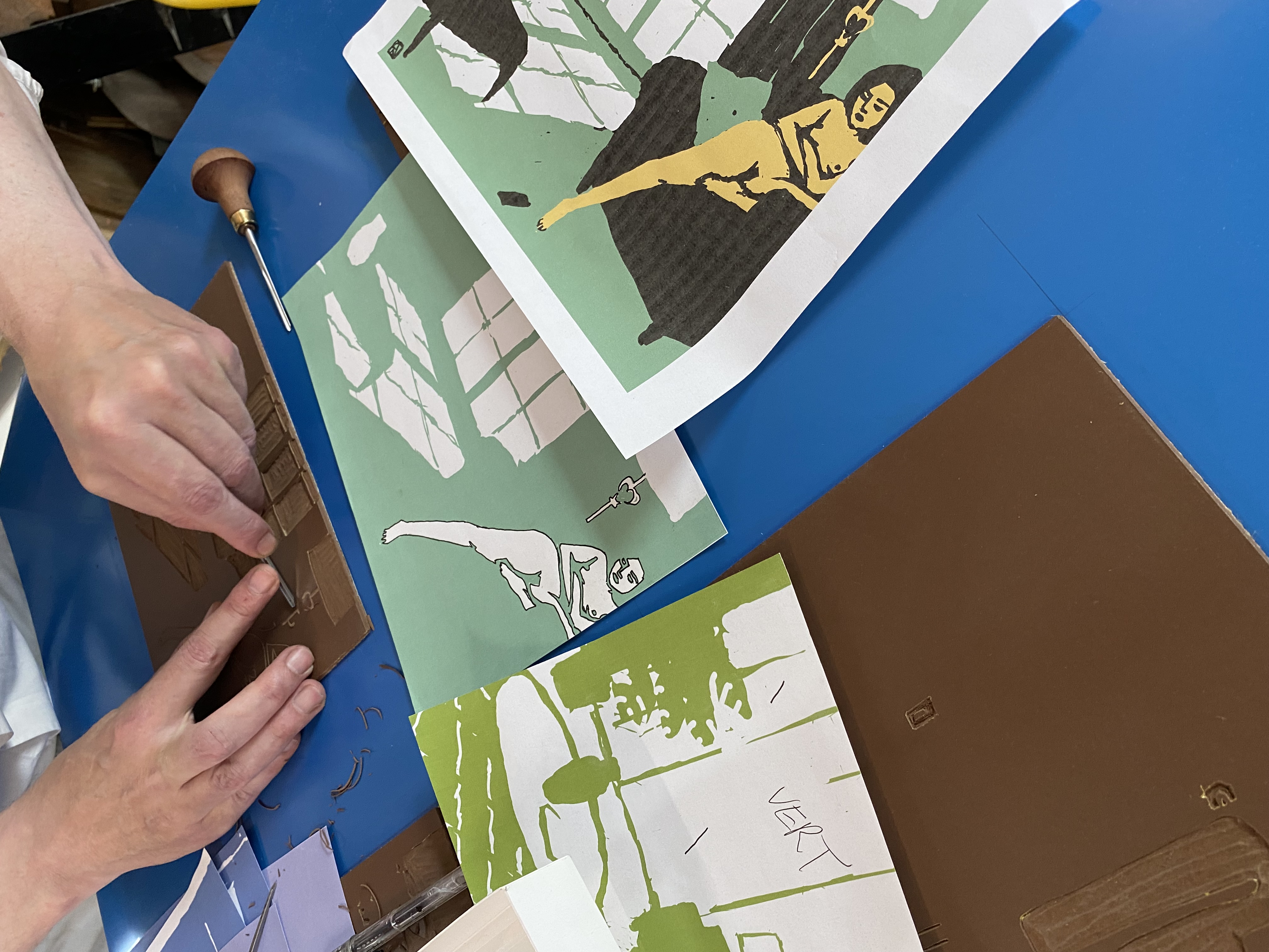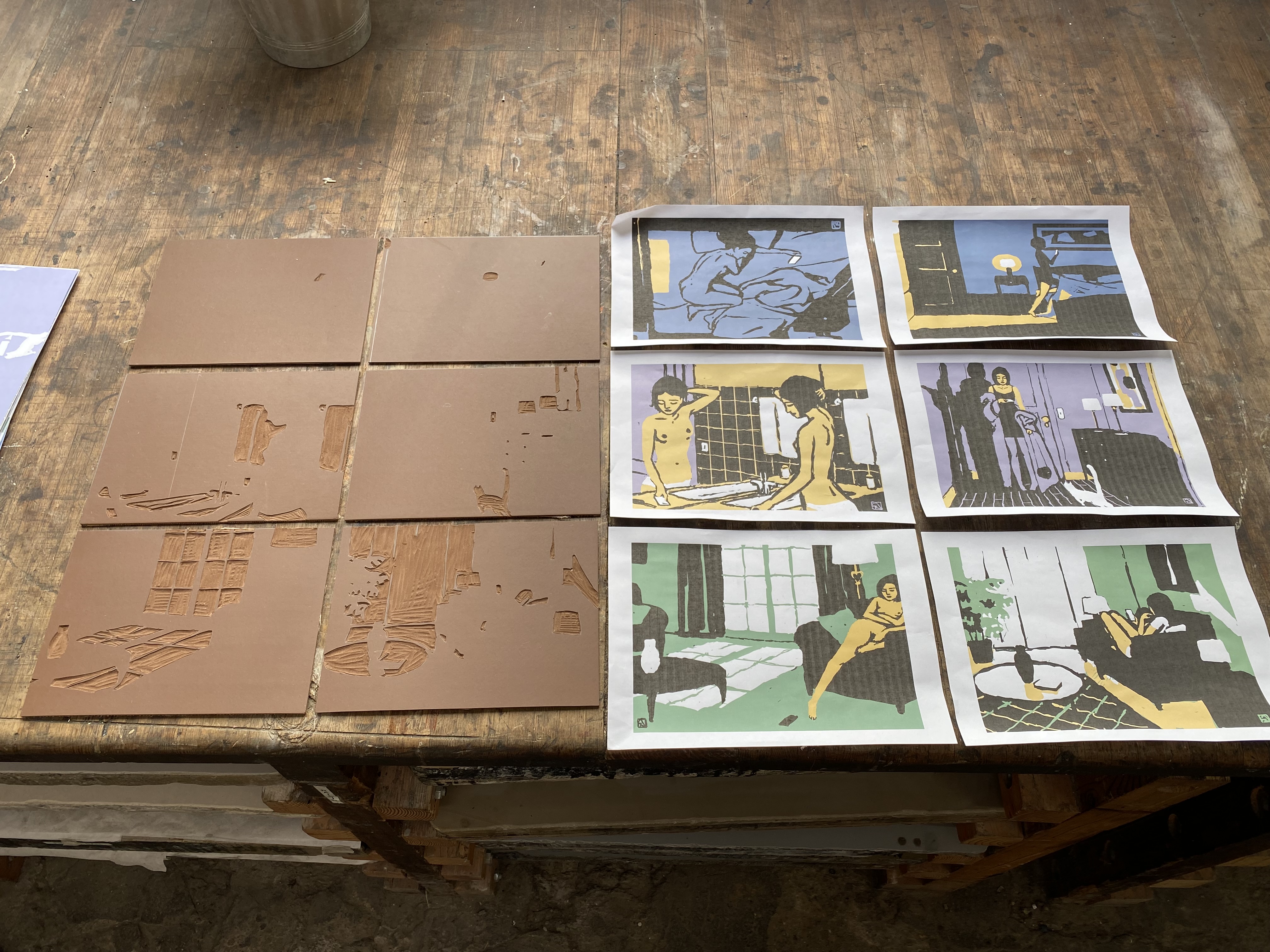 Suite de 6 linogravures en 3 couleurs sur papier Arches 270 grammes