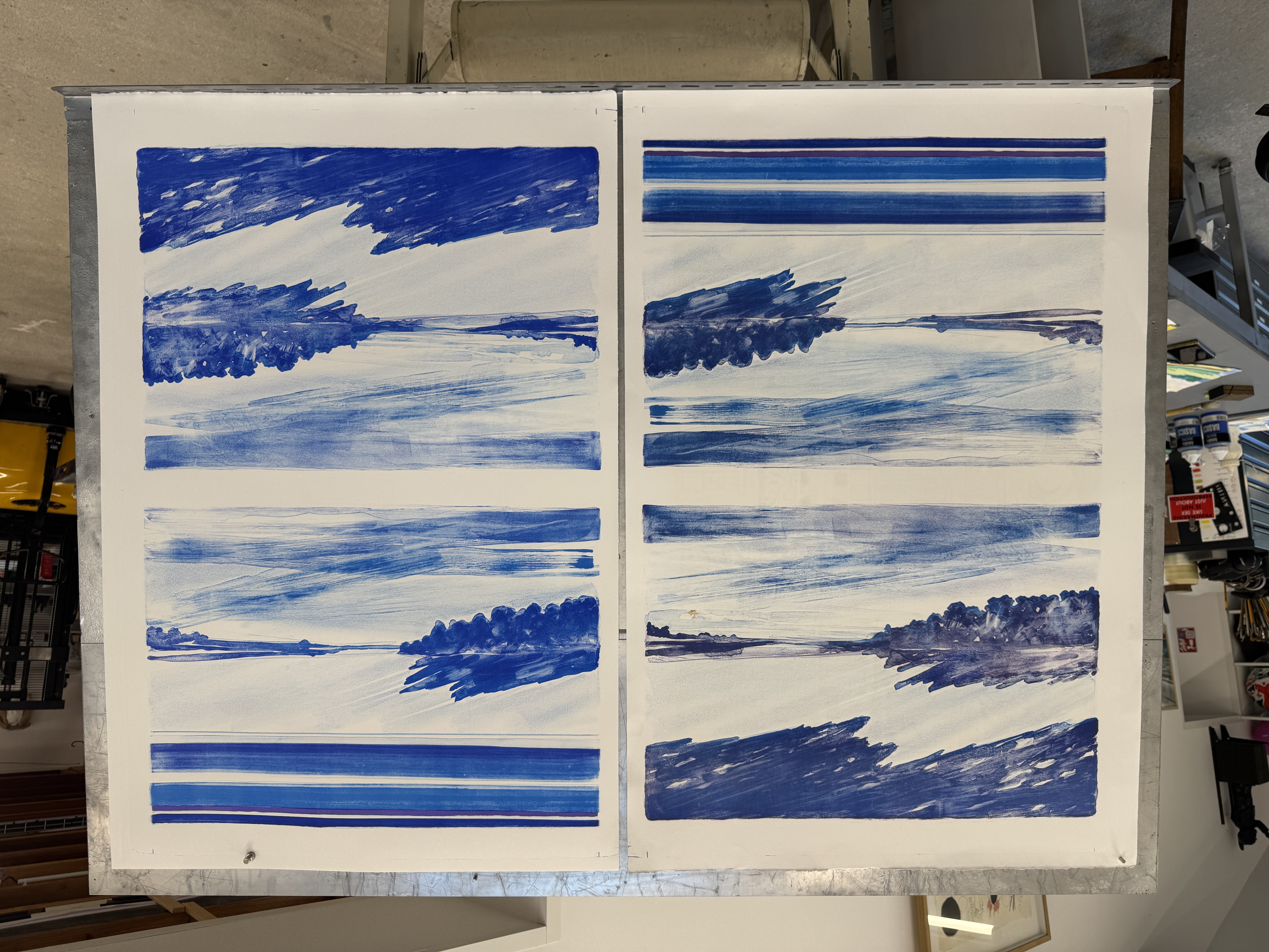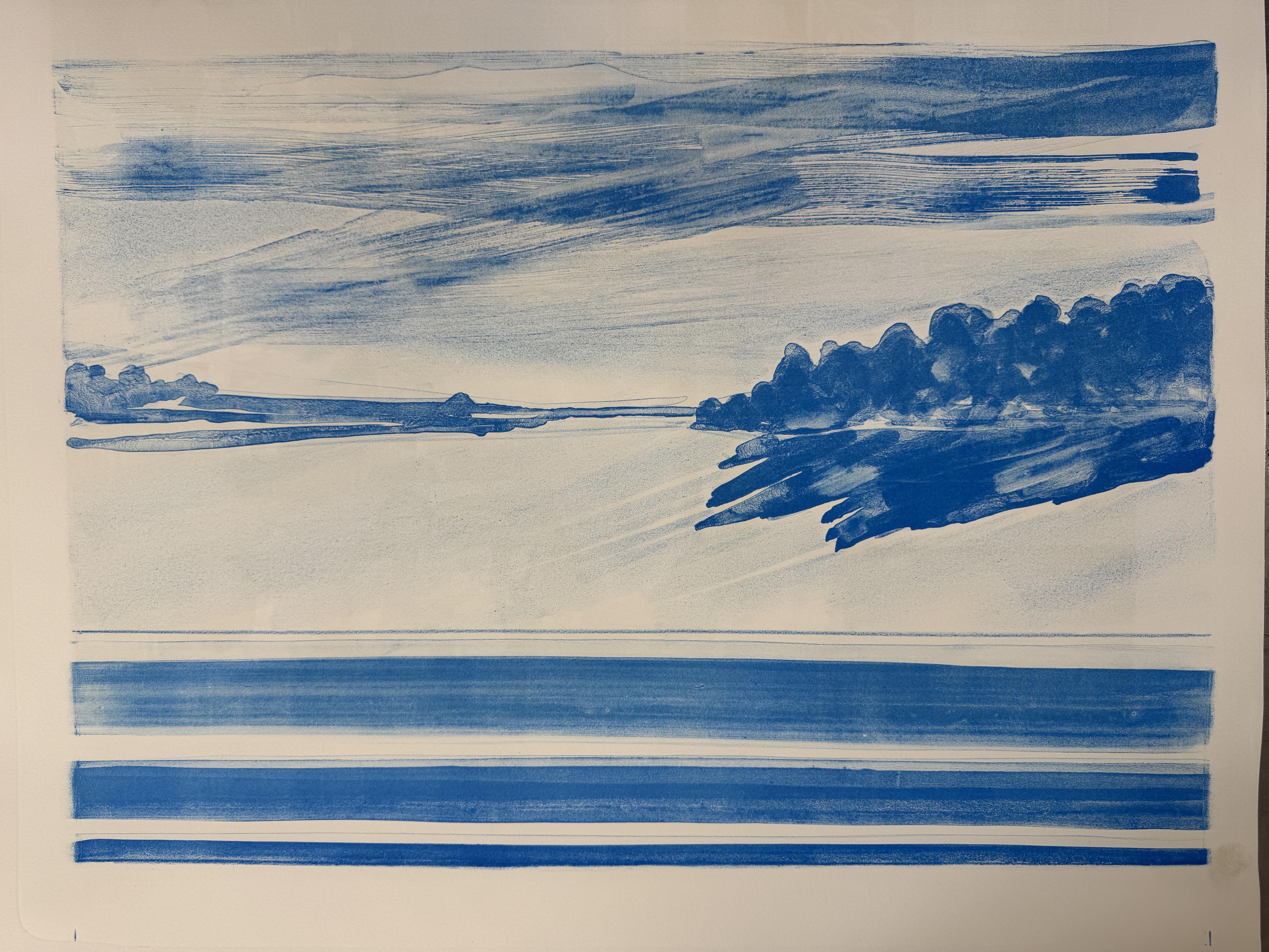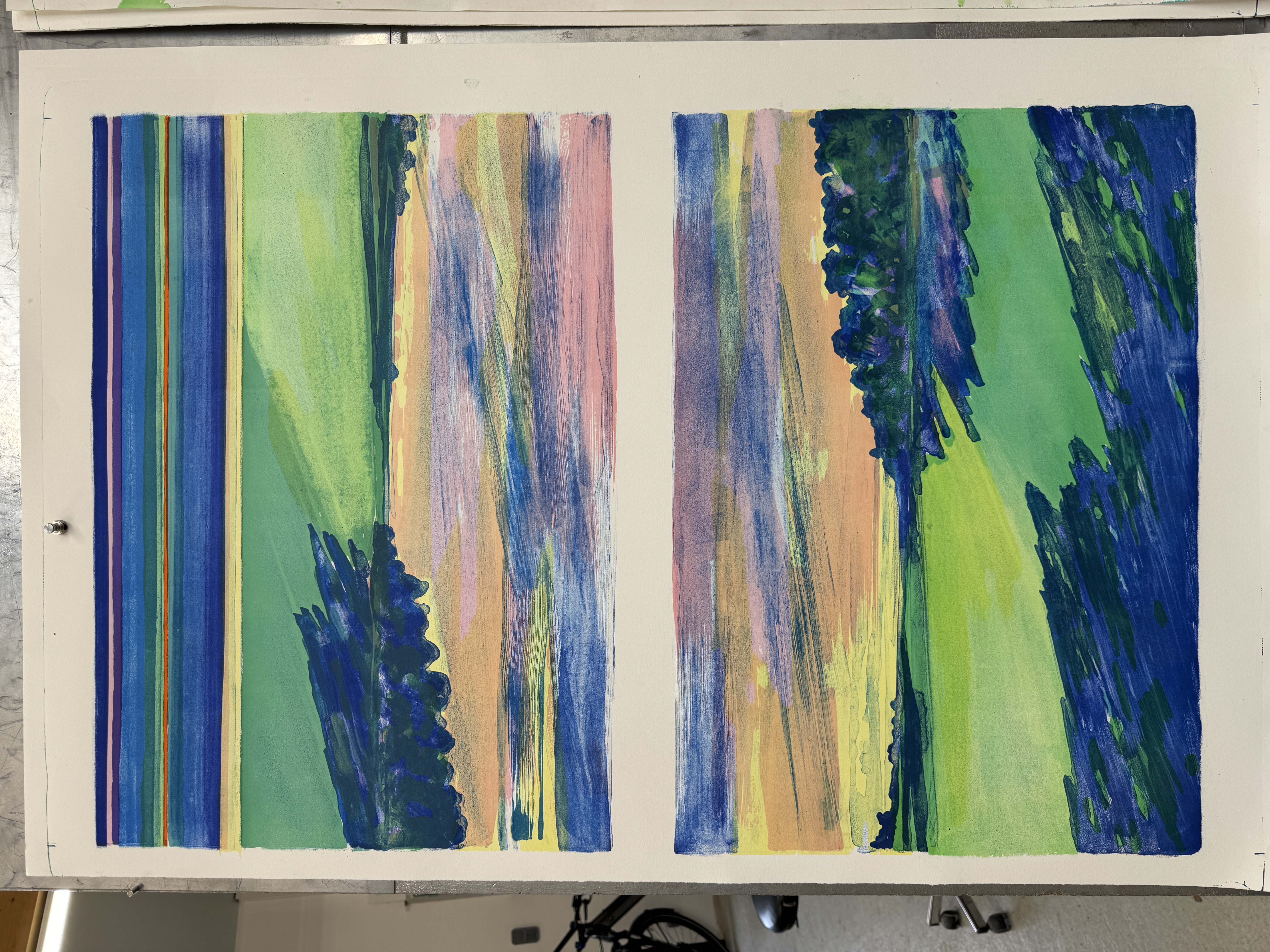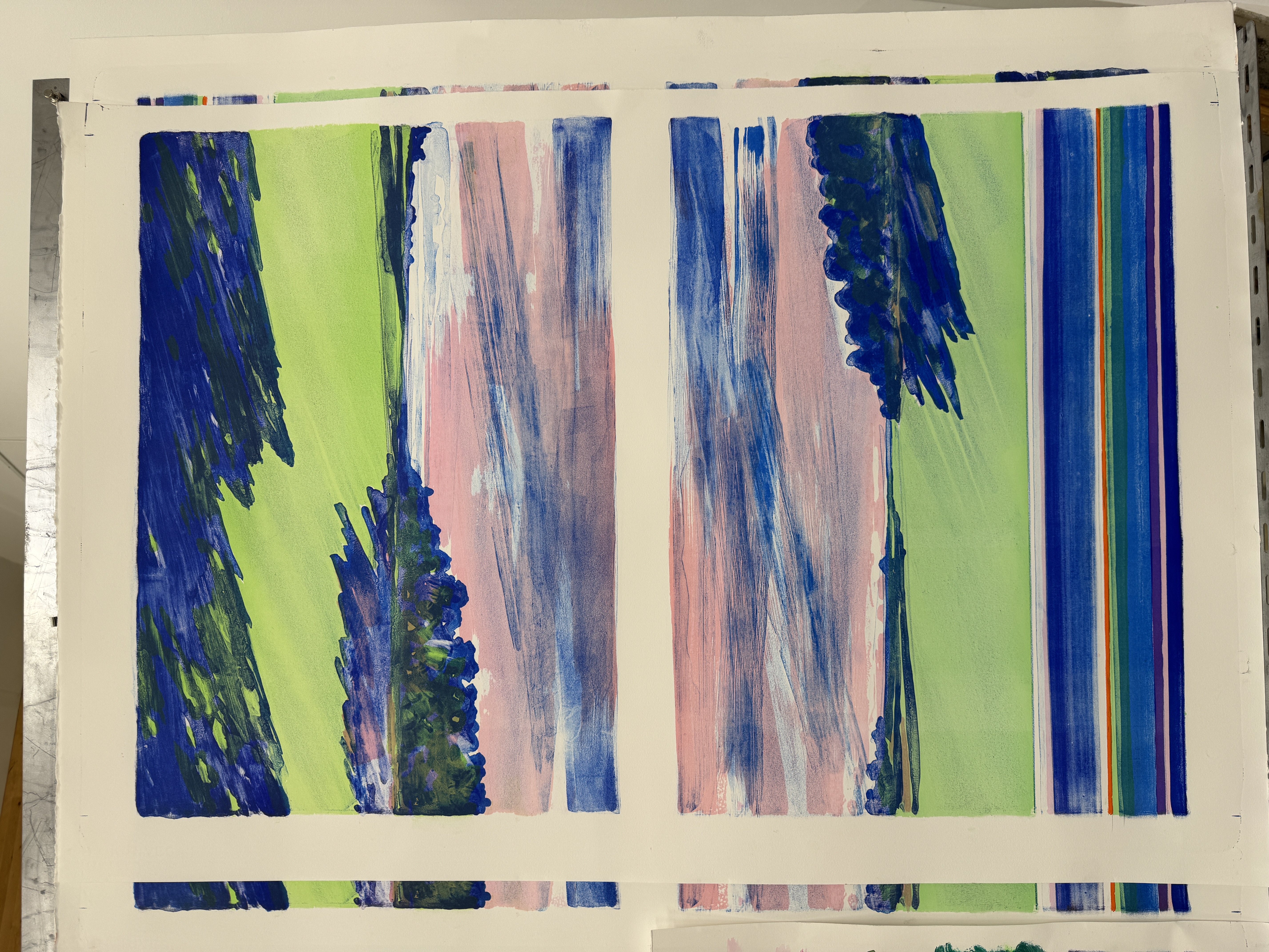 Monotype original en couleurs sur fond d'impression en lithographie 3 couleurs, sur papier BFK Rives 300 grammes